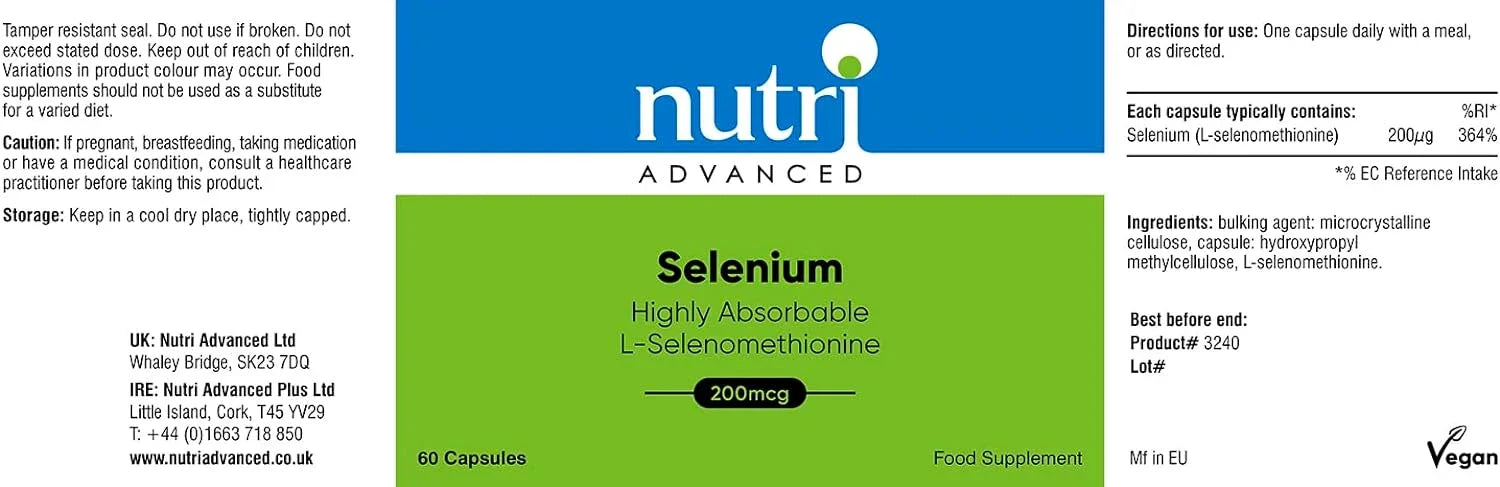 Nutri Advanced Selenium 200ug 60 Caps is a dietary supplement intended to help support the maintenance of optimal health. The main ingredient is selenium, a powerful mineral known for its antioxidant properties.