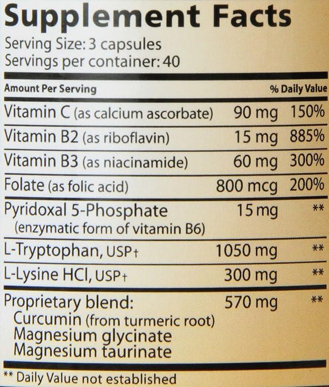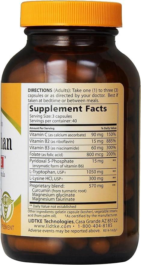 L-Tryptophan Complete 120 caps comes in a bottle that contains 120 capsules, which is designed for 30 servings if taking 4 capsules per day. This supplement includes a mixture of naturally sourced L-Tryptophan and various co-factors. L-Tryptophan is an essential amino acid that the body uses to synthesize proteins and the neurotransmitter serotonin.